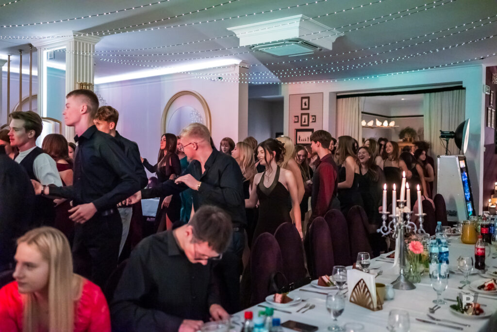 Wieczór rozpoczął się oficjalnie – powitaniem uczniów i nauczycieli, krótkimi przemówieniami i pierwszymi toastami. Mimo lekkiego stresu w powietrzu unosiła się ekscytacja. Na zdjęciach widać eleganckie stroje, skupione spojrzenia, pierwsze uśmiechy i to charakterystyczne napięcie przed rozpoczęciem zabawy, które po chwili ustąpiło radości.